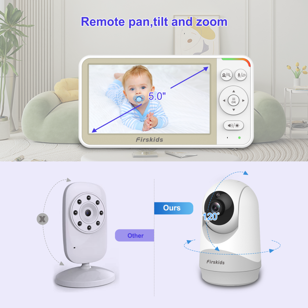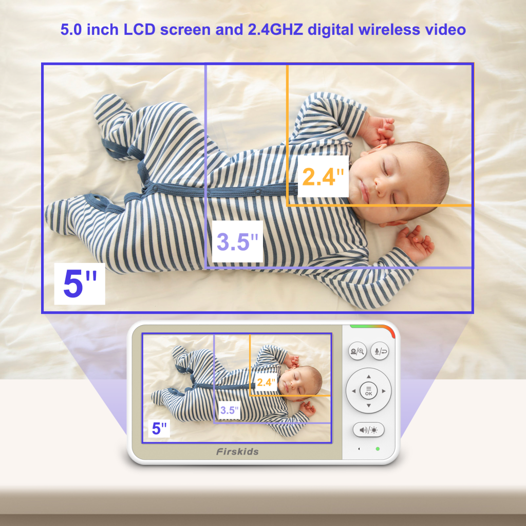 - 5.0″ HD LCD monitor and 4D infrared night vision: The 5.0″ monitor gives you an unobstructed view of your sweet baby’s body – no movement is overlooked. The camera can zoom in or out of view with digital zoom to better look at your baby. The camera captures clear images of your baby in dark or low-light conditions, and the night vision feature allows you to clearly see your baby dozing off. We are the first brand to use invisible infrared LED baby monitor, you can have a clear video picture at night without worrying about disturbing your baby.