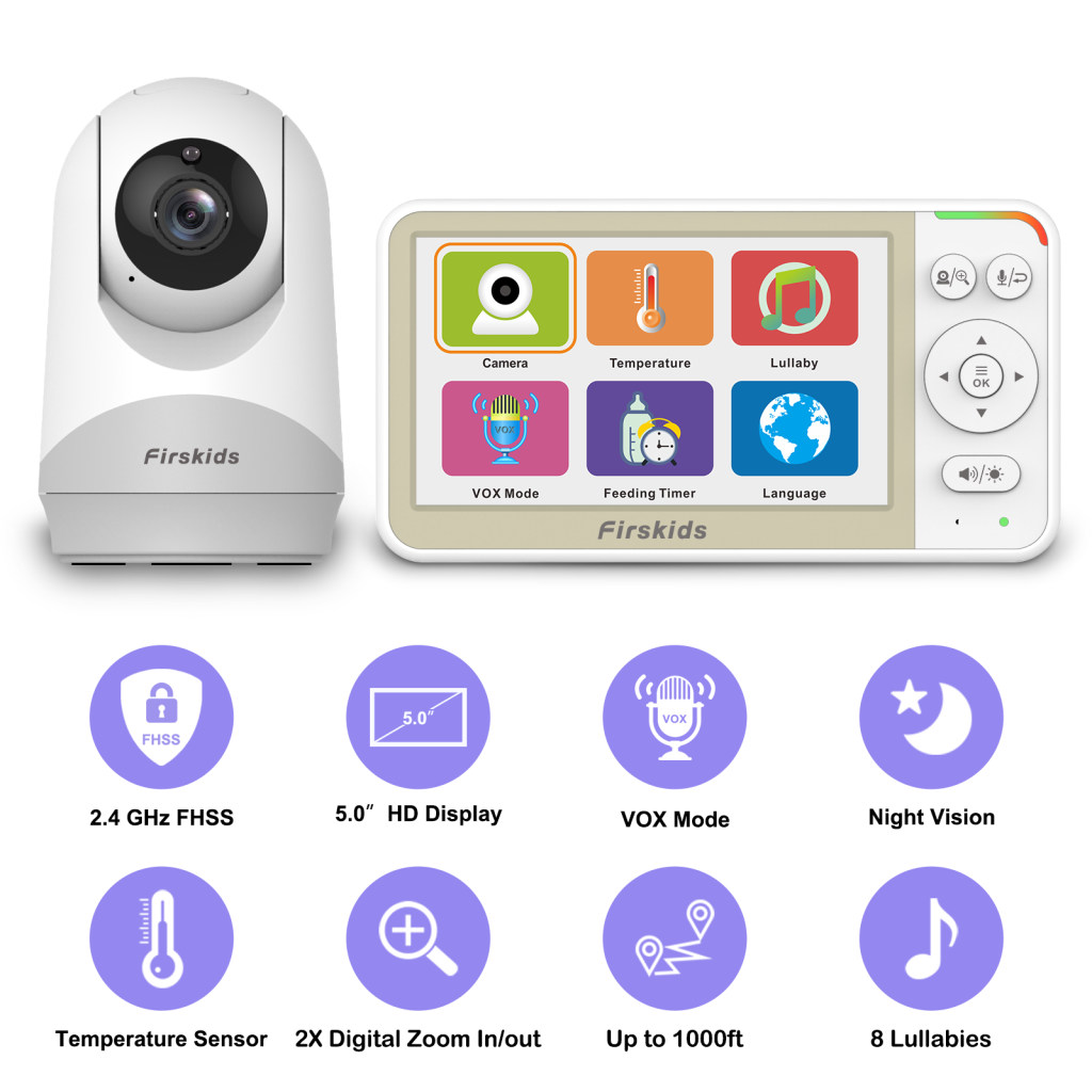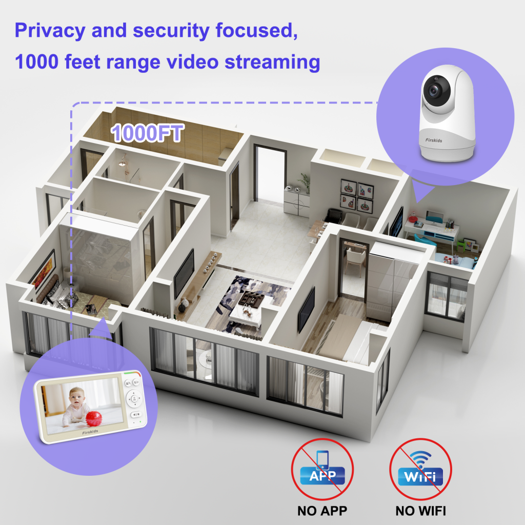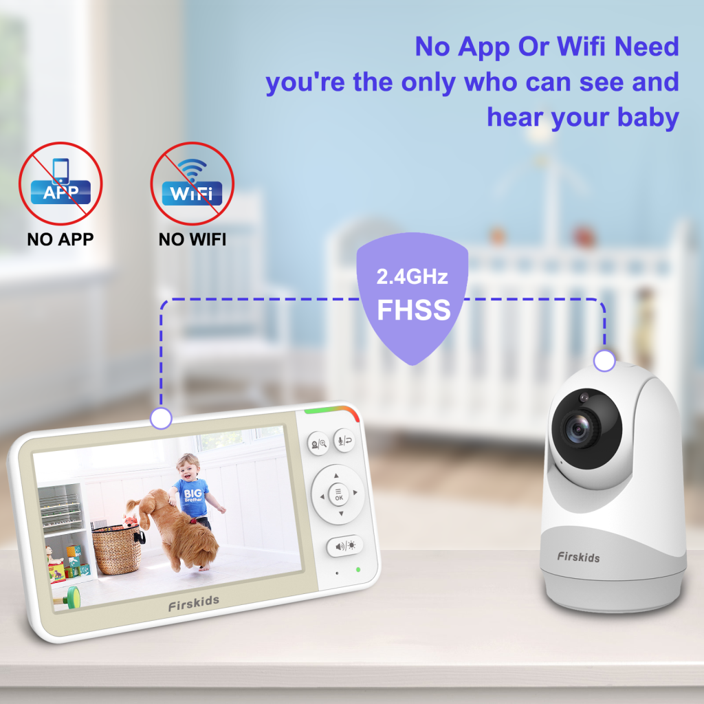 - No Wi-Fi: Trusted by American families for years, the FK5662 baby monitor transmits over a secure internal 2.4GHz channel and FHSS encryption technology, data transfer between the camera and the monitor is very fast, so you can rest assured that only you can hear and see your baby and you don’t need to worry about the risk of being hacked.