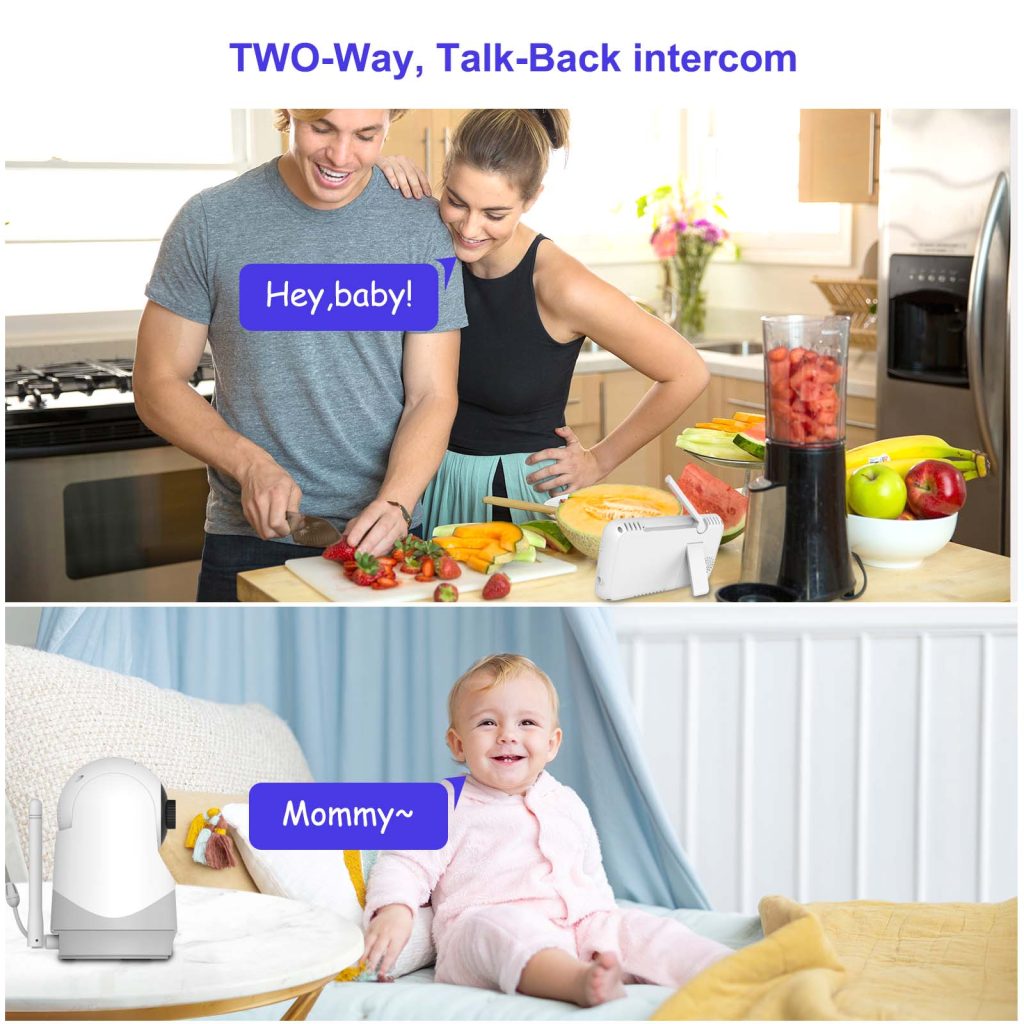 - Lullaby and intelligent two-way intercom function: crystal clear two-way audio function, so that both ends of the conversation are clearly visible, the system supports two-way intercom, so that your baby can hear your voice wherever you are, 8 lullabies, soothe your baby to sleep quickly, sound level LED indicator, audio only power saving mode, desktop or wall mounting options, multi-camera extension, ideal gift for baby registration, gift for new parents.