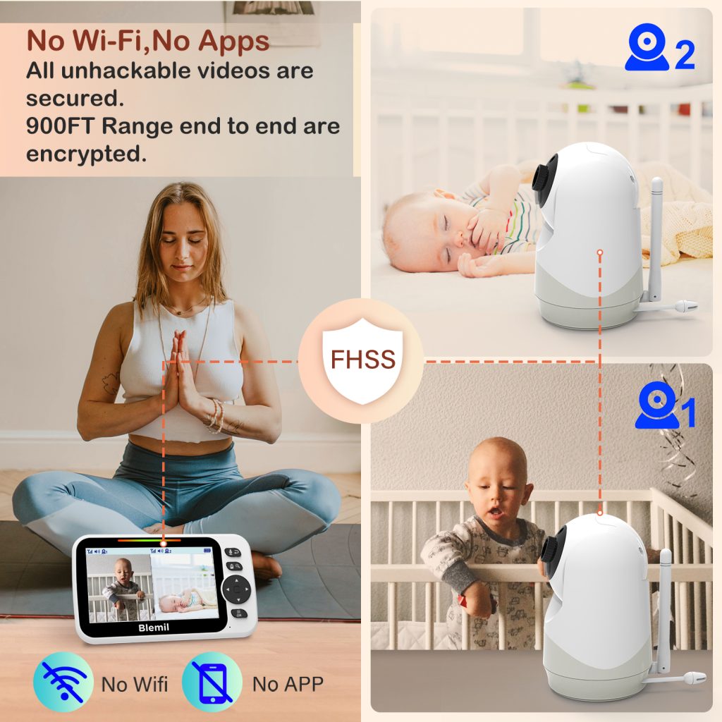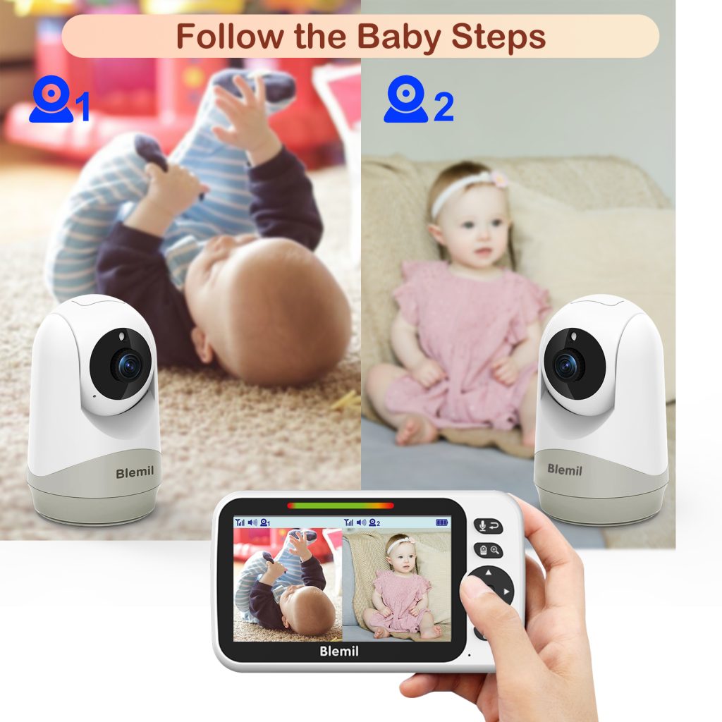 - 【Split Screen & Dual Cameras】The video baby monitor with 2 cameras and split-screen feature, give you a larger viewing angle to monitor your baby. You can see two babies in different rooms side by side on the same screen.