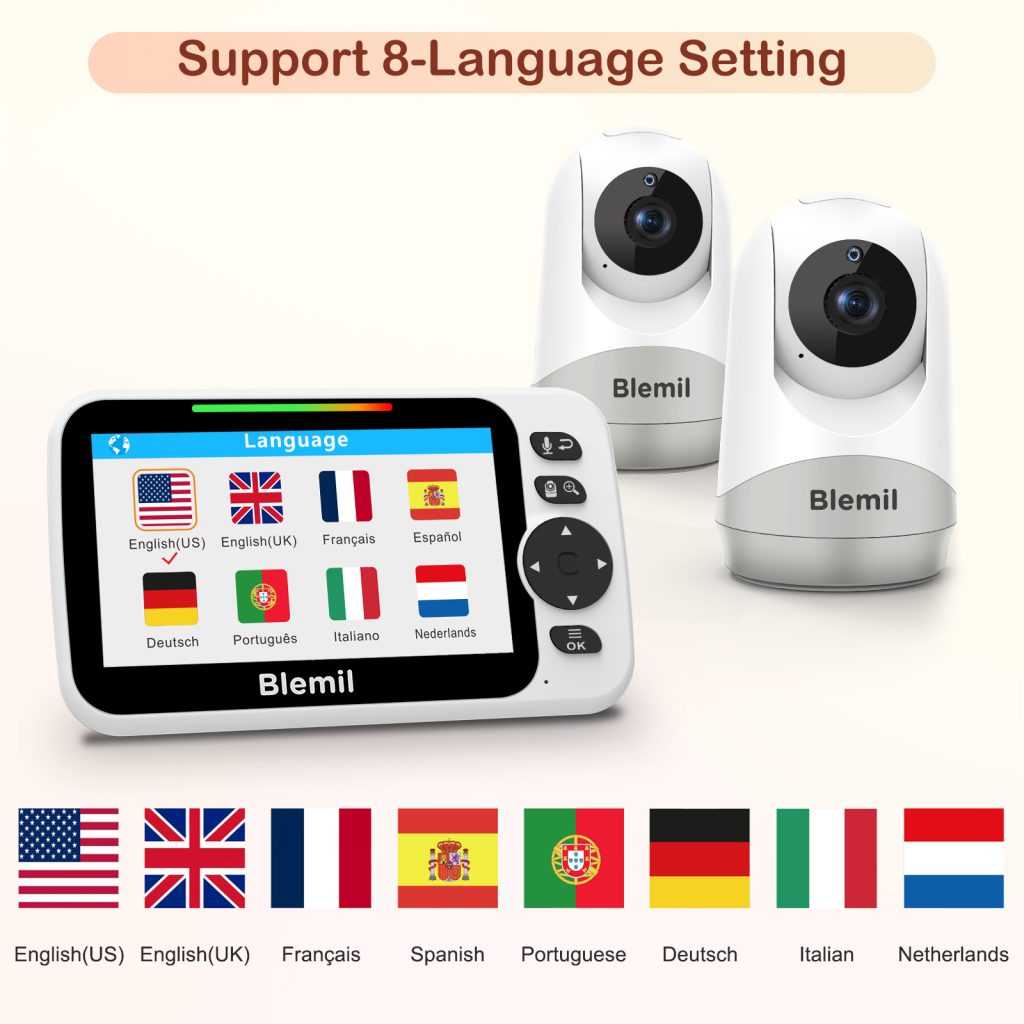 - 【Two Way Talk & Other Helpful Features】Two way audio, feeding alarm, temperature monitoring and lullabies help you to be a happy mommy& daddy. You can talk to baby with 2 way audio function or set the temperature alert level via your baby monitor. The baby monitor with camera and audio also supports eight languages, which makes it easy for parents using different languages to operate.