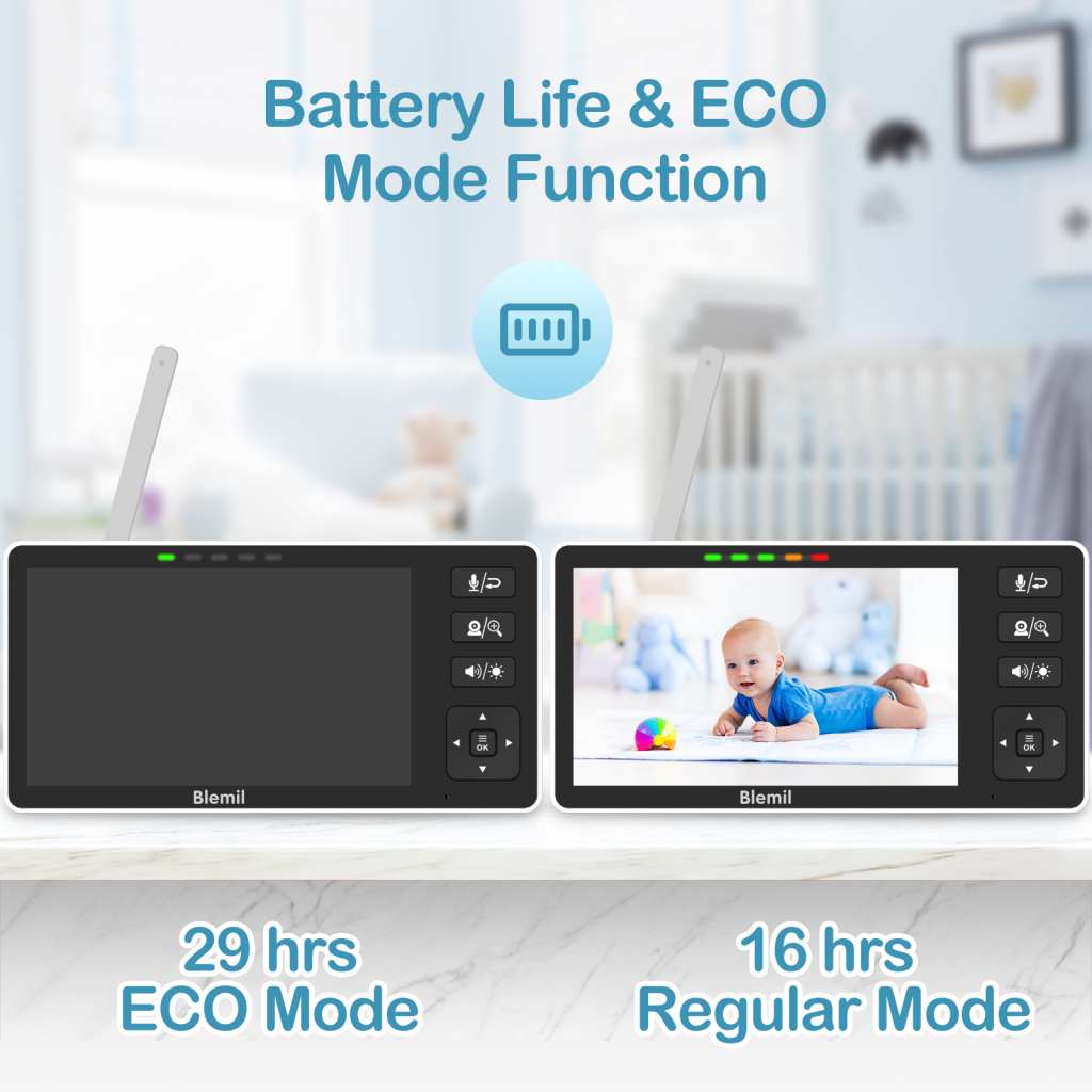 - ❤ ECO power-saving mode: This baby monitor has an ECO power-saving mode. In ECO mode, the screen of the baby camera will sleep to save power. And when the baby suddenly wakes up and cries, the parents will turn on the work mode to remind you in a timely manner. The ECO mode can effectively save electricity and contribute to environmental protection.