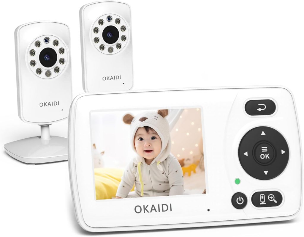 - OKAIDI Video Baby Monitor with 2 Cameras:This baby monitor kit contains 1 monitor and 2 cameras, and it supports matching up to 4 cameras. The baby monitors can be used in different scenarios such as home security monitoring, baby care monitoring, elderly monitoring, pet monitoring, etc. The display images of the 2 cameras can be switched from the monitor, and the full screen can see more details than the split screen.